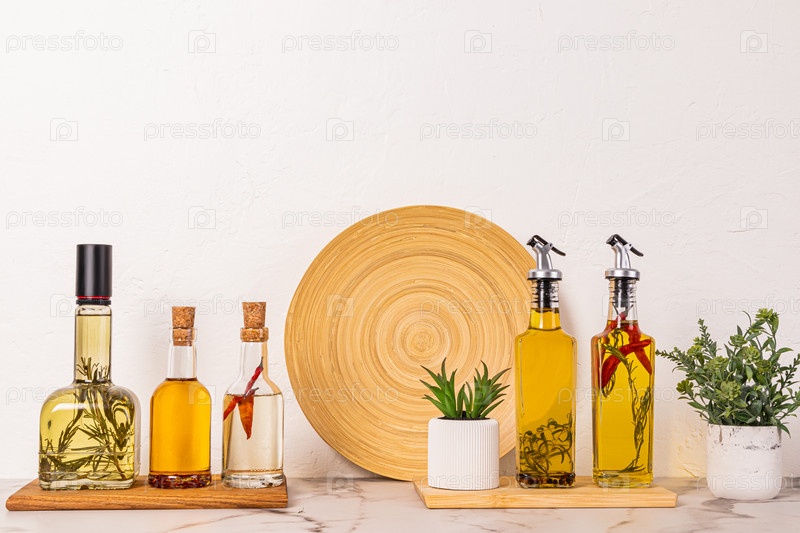 Много разных бутылок с маслом, горшечных растений. Современный вид кухонного пространства. Экологичная кухня. Вид спереди современной кухни