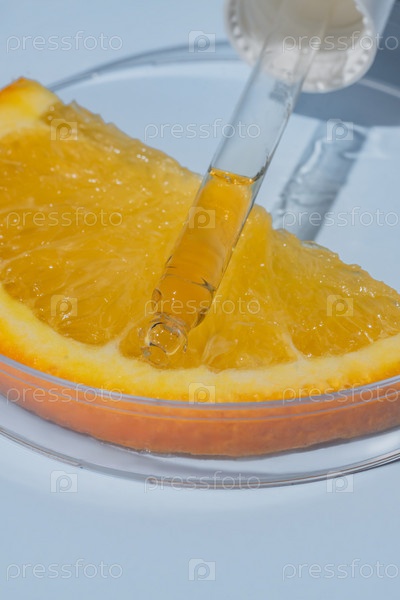 Стеклянная пипетка кислоты AHA на апельсине в стеклянной чашке Петри, синий фон