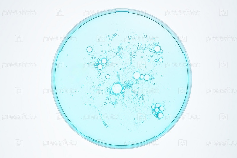 Лабораторная чашка Петри и сыворотка для лица на синем фоне. Альтернативная медицина, косметические исследования. Уход за кожей. Дерматология. Вид сверху