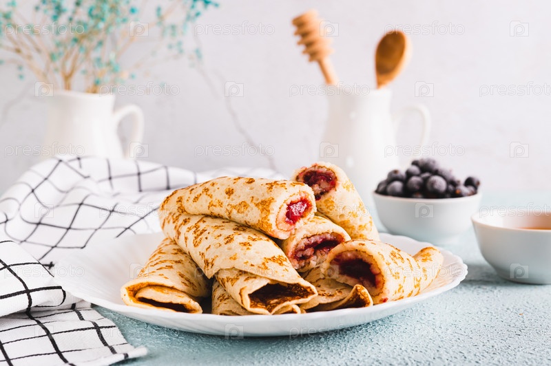 Домашние блинчики с ягодной начинкой на тарелке на столе