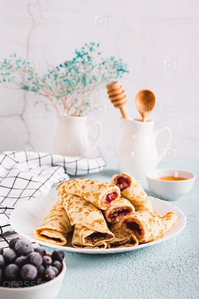 Домашние блинчики с ягодной начинкой на тарелке на столе, вертикальный вид