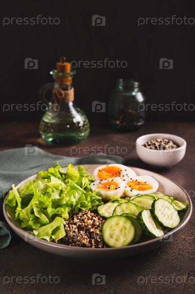 Чаша с киноа, огурцом, вареным яйцом, салатом и семенами кунжута на столе, вертикальный вид