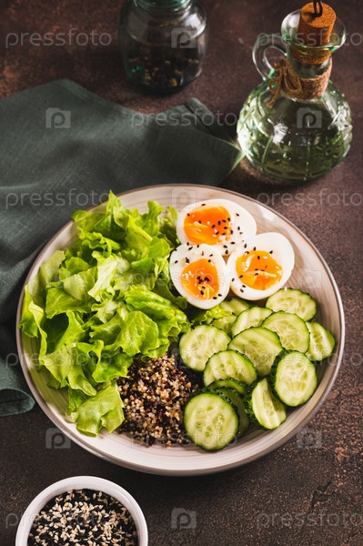 Фитнес-тарелка с киноа, огурцом, яйцом и салатом на столе, вертикальный вид