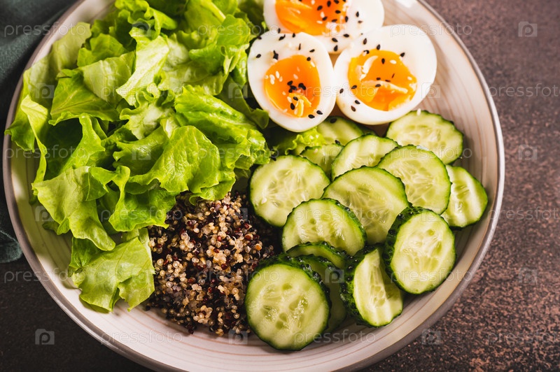 Крупным планом фитнес-тарелка с киноа, огурцом, яйцом и салатом на столе
