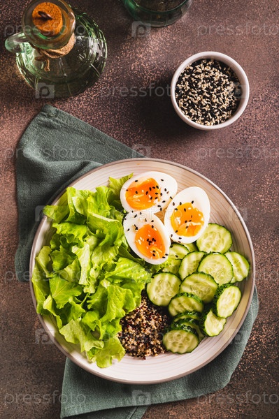 Фитнес-тарелка с киноа, огурцом, яйцом и салатом на столе и вертикальный вид