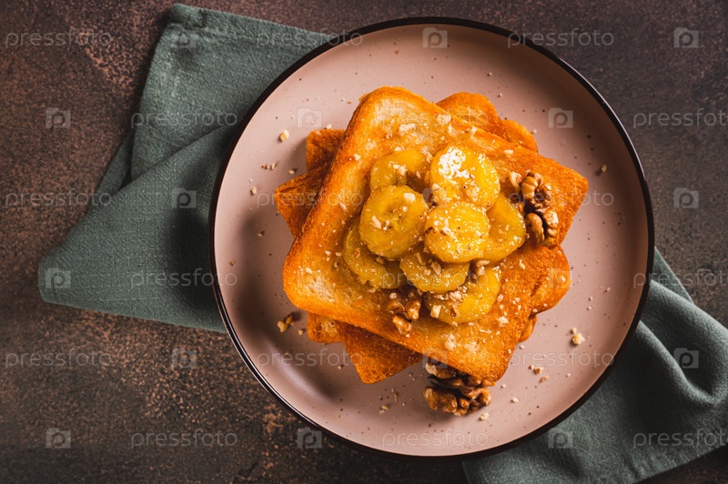 Крупный план тостов с карамелизированным бананом, медом и грецкими орехами на завтрак на столе