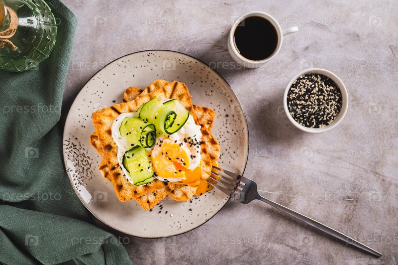 Тосты со сливочным сыром, огурцом, яйцом-пашот и кунжутом на тарелке, вид сверху