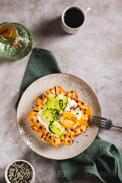 Вафли с яйцом-пашот, огурцом и сметаной на тарелке на столе и вертикальный вид