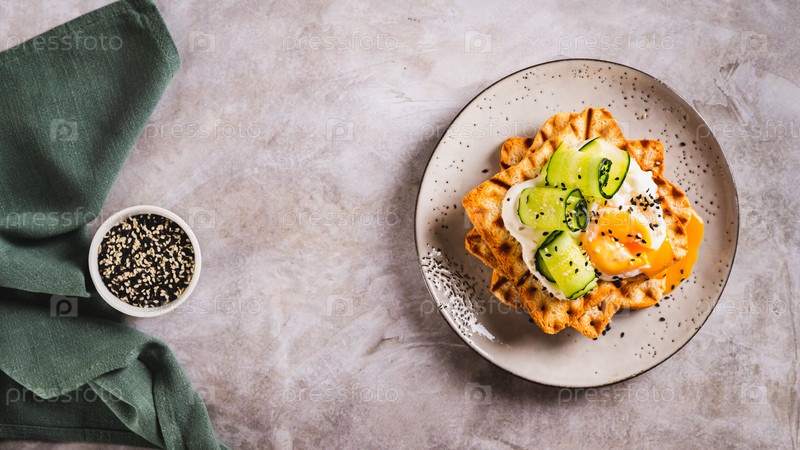 Вафли с яйцом-пашот, огурцом и сметаной на тарелке на столе, вид веб-баннера