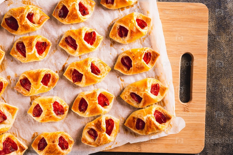 Домашние конверты с сыром и колбасой пепперони на бумаге на доске, вид сверху