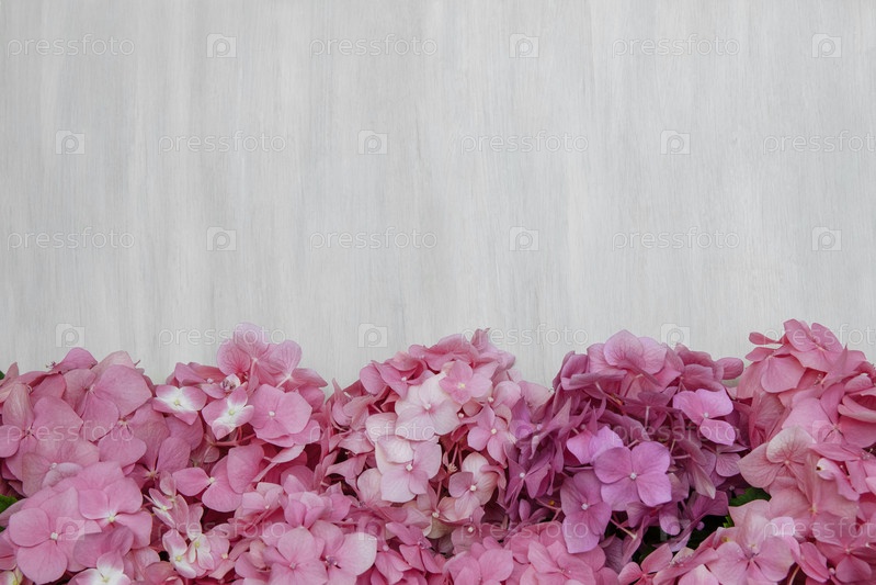 Розовые цветы гортензии на белом деревянном фоне крупным планом, концепция поздравительной открытки, женский день 8 марта и день рождения, шаблон оформления обложки, пространство для копирования