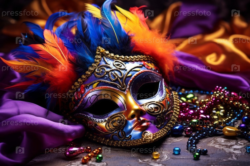 Праздничная, красочная Марди Гра или карнавальная маска и бусы на золотом, зеленом и фиолетовом фоне
