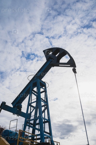 Масляный насос на фоне голубого неба и утреннего солнца, солнечные блики на масляном насосе