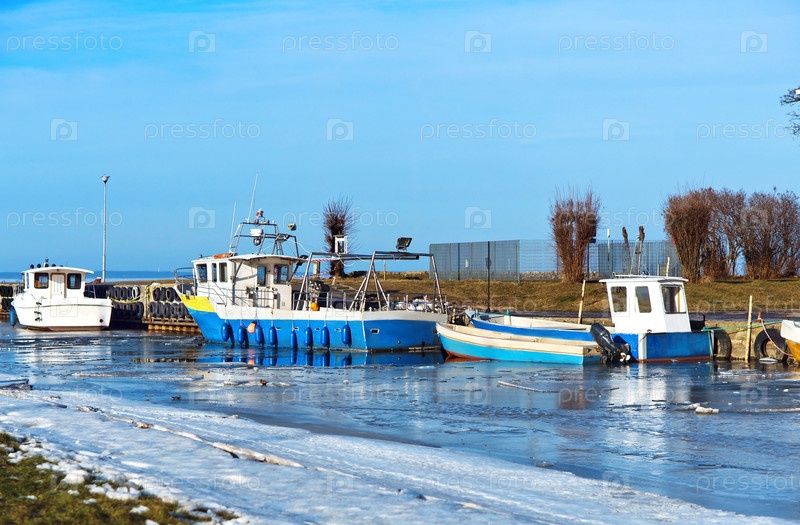 Рыбацкая лодка на пристани зимой, рыбацкая лодка, стоящая у берега во льду