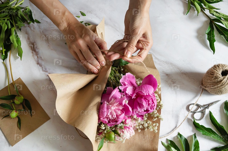 Женщина-флорист делает на своем рабочем столе букет цветов пиона, завернутый в крафт-бумагу. Вид сверху. Фотографии высокого качества