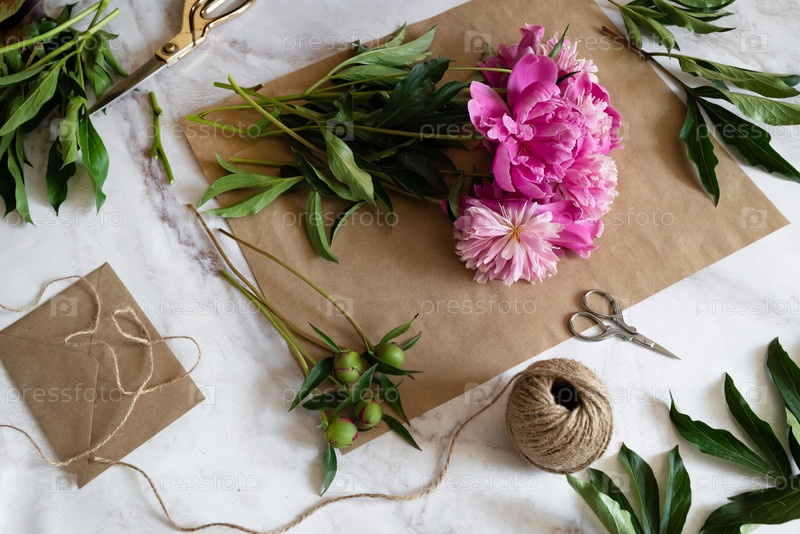 Флорист за работой: красивая женщина делает летний букет пионов на рабочем сером столе. Крафт-бумага, ножницы, конверт для поздравления на столе. Вид сверху. Плоская композиция