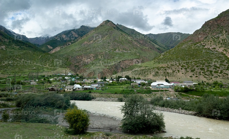 Балкарское село Верхний Баксан (1500 м над уровнем моря), бурная река Баксан и гора Сабамык. Кабардино-Балкария, Россия