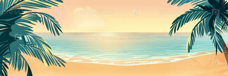 Широкий фон в стиле акварели с двумя пальмами, морем, песчаным берегом и свободным местом для копирования