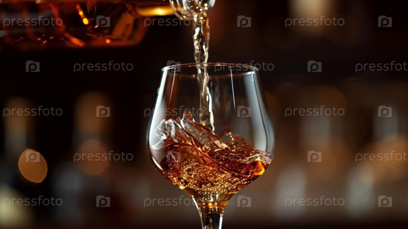 Крупный план стакана, в который наливается коньяк из бутылки на темном фоне