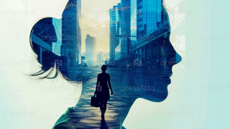 Двойная экспозиция: крупный план головы девушки, внутри которой женщина идет от нас по улице