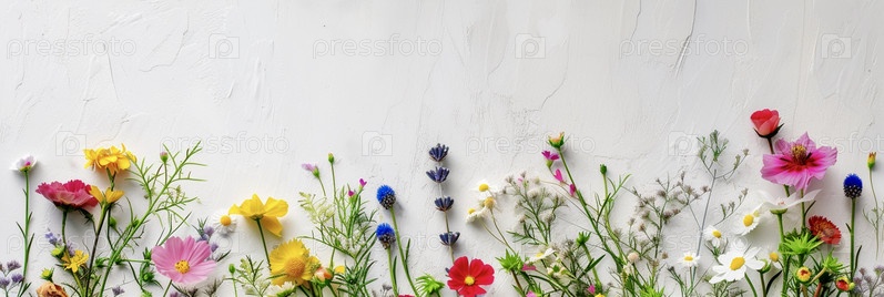 На белом фоне внизу выложены ромашки, васельки, розовые ромашки и другие весенние цветы