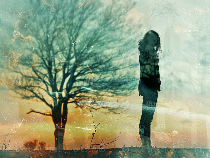 Силуэт одинокой девушки, стоящей на лугу на фоне заходящего солнца и голого дерева