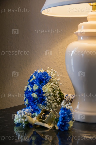 Свадебный набор аксессуаров, кольца, букет невесты, бутоньерка. Селективный фокус