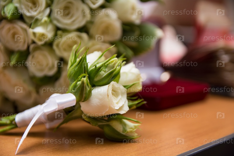 Свадебный букет, бутоньерка, обручальные кольца, сборы жениха
