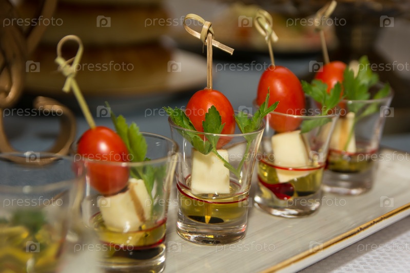 Маринованные канапе, хлеб, помидоры черри, сыр. Холодные закуски. Селективный фокус
