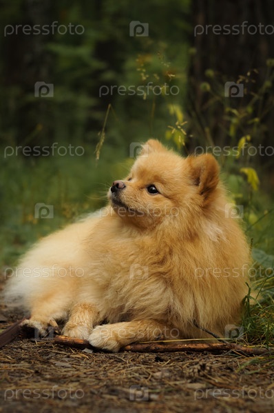 Чистокровный немецкий шпиц лежит на поляне в лесу. Прогулка с собакой в лесу. Не смотрит в камеру, вертикальная композиция