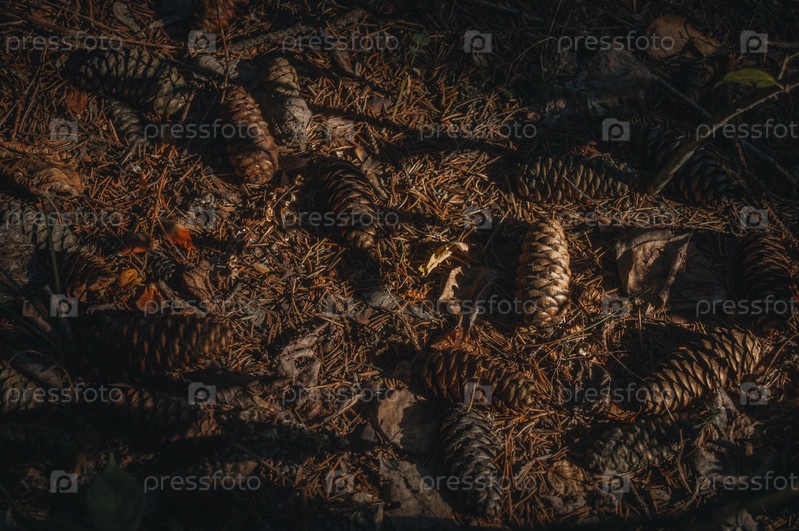 Еловые шишки на земле среди опавших иголок в тени и утреннем свете. Темное фото, выборочный фокус