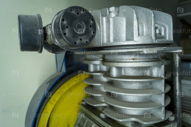 Головка блока цилиндров старого воздушного компрессора с электродвигателем. Промышленное оборудование для подачи сжатого воздуха в пневмосистему. Селективный фокус