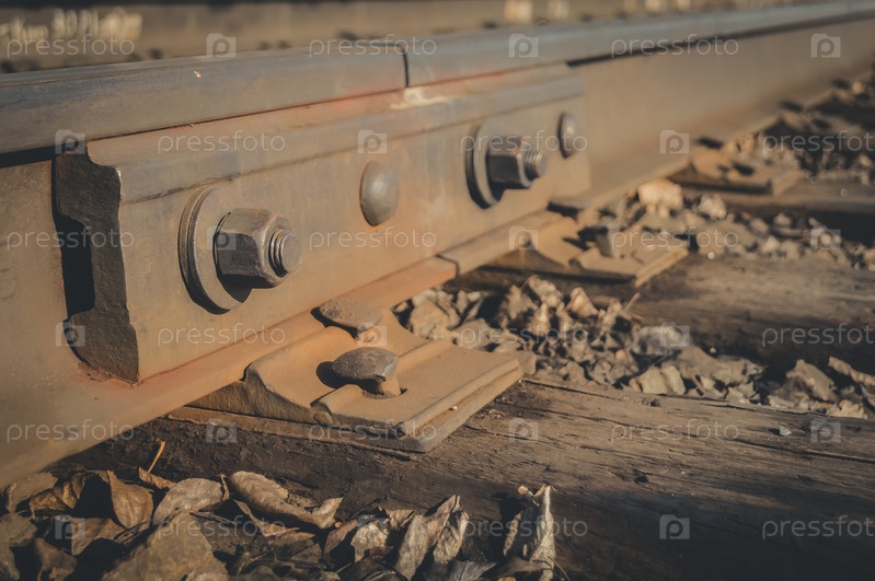 Старая железная дорога. Крупный план элемента рельсового соединения. Деревянные шпалы. Ржавые рельсы. Селективный фокус