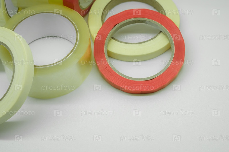 Несколько роликов скотча разного назначения. Краска и клейкая лента. Селективный фокус