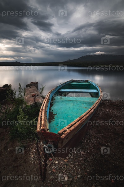 Лодка пришвартованная к берегу озера под грозовыми облаками