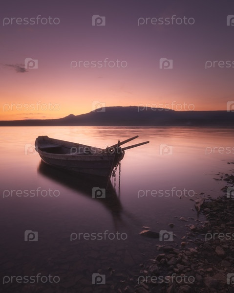 Деревянная лодка в воде на берегу горного озера после заката