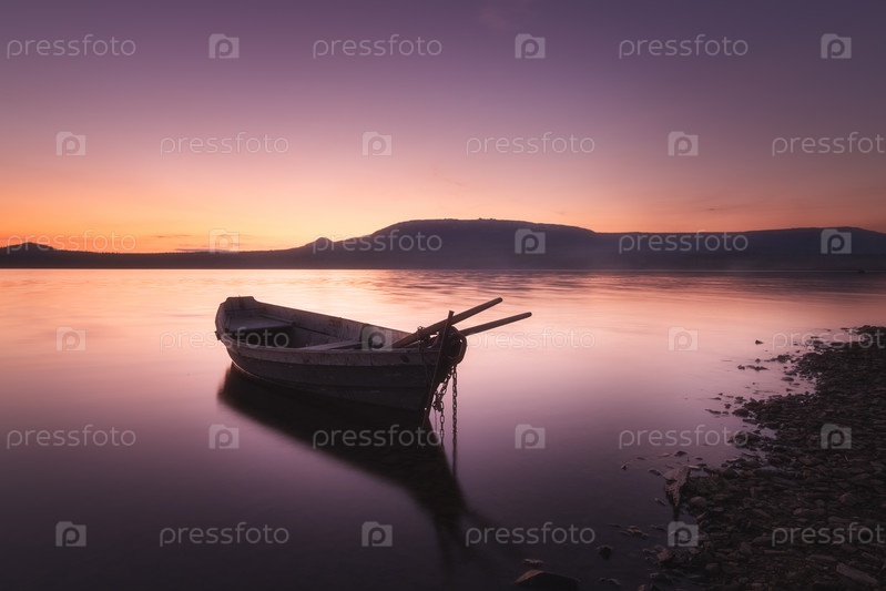 Деревянная лодка в воде на берегу горного озера после заката