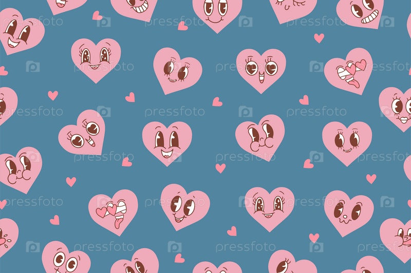 Векторный рисунок с милыми мультяшными розовыми сердечками. Бесшовный узор ко Дню святого Валентина. Модные ретро-мультяшные сердечные персонажи бесшовный фон. Заводной стиль, винтаж, эстетика 70-х 60-х