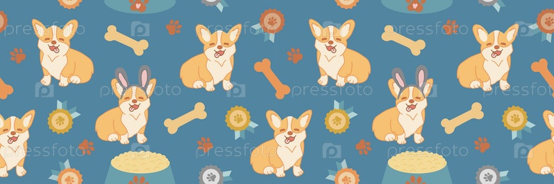 Бесшовный узор с мультяшным рисунком собаки Корги и медалями. Векторная иллюстрация на синем фоне. Вектор