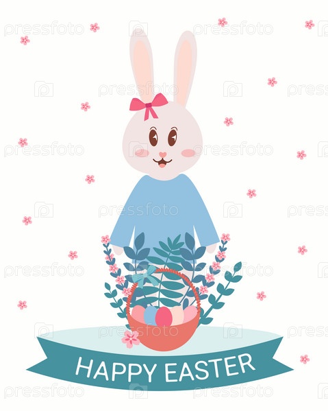 Счастливая пасхальная векторная иллюстрация. Пасхальный плакат с кроликом, корзиной, разноцветными яйцами и цветами