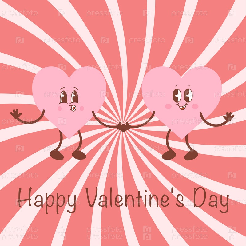 Симпатичные мультяшные сердечки на фоне в стиле ретро. Симпатичные символы любви с лицами в разных позах, руками и ногами, забавными положительными эмоциями. Векторная иллюстрация ко Дню святого Валентина