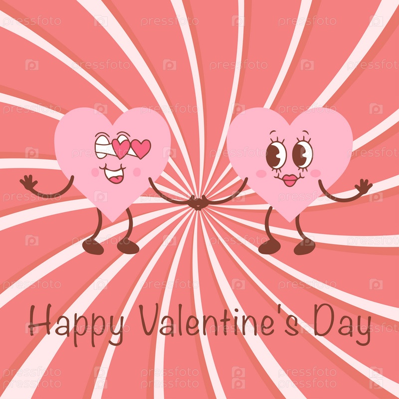 Симпатичные мультяшные сердечки на фоне в стиле ретро. Симпатичные символы любви с лицами в разных позах, руками и ногами, забавными положительными эмоциями. Векторная иллюстрация ко Дню святого Валентина