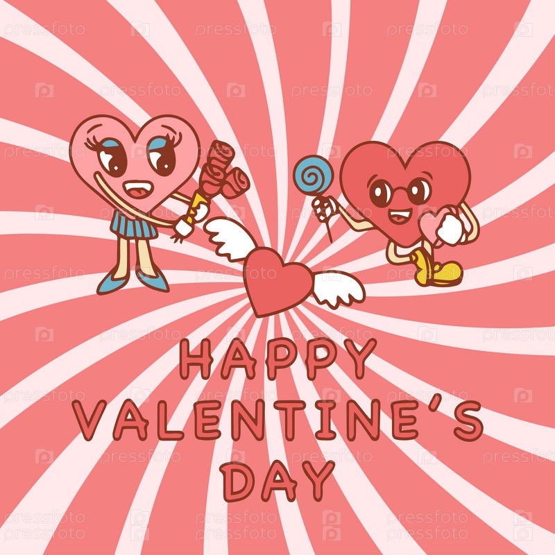 Симпатичные мультяшные сердечки на фоне в стиле ретро. Симпатичные символы любви с лицами в разных позах, руками и ногами, забавными положительными эмоциями. Векторная иллюстрация ко Дню святого Валентина