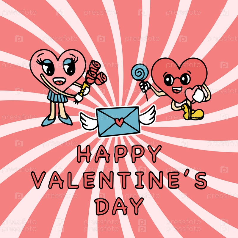 Симпатичные мультяшные сердечки на фоне в стиле ретро. Симпатичные символы любви с лицами в разных позах, руками и ногами, забавными положительными эмоциями. Векторная иллюстрация ко Дню святого Валентина
