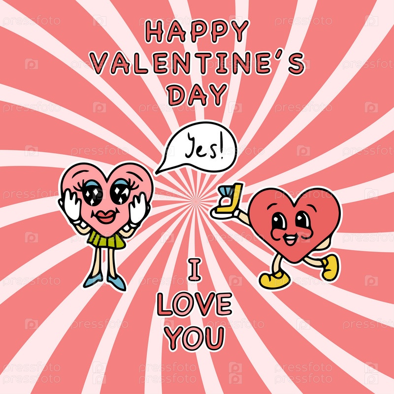 Симпатичные мультяшные сердечки на фоне в стиле ретро. Симпатичные символы любви с лицами в разных позах, руками и ногами, забавными положительными эмоциями. Векторная иллюстрация ко Дню святого Валентина