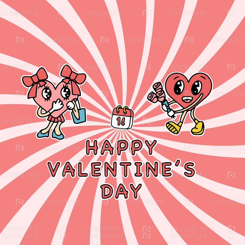 Симпатичные мультяшные сердечки на фоне в стиле ретро. Симпатичные символы любви с лицами в разных позах, руками и ногами, забавными положительными эмоциями. Векторная иллюстрация ко Дню святого Валентина