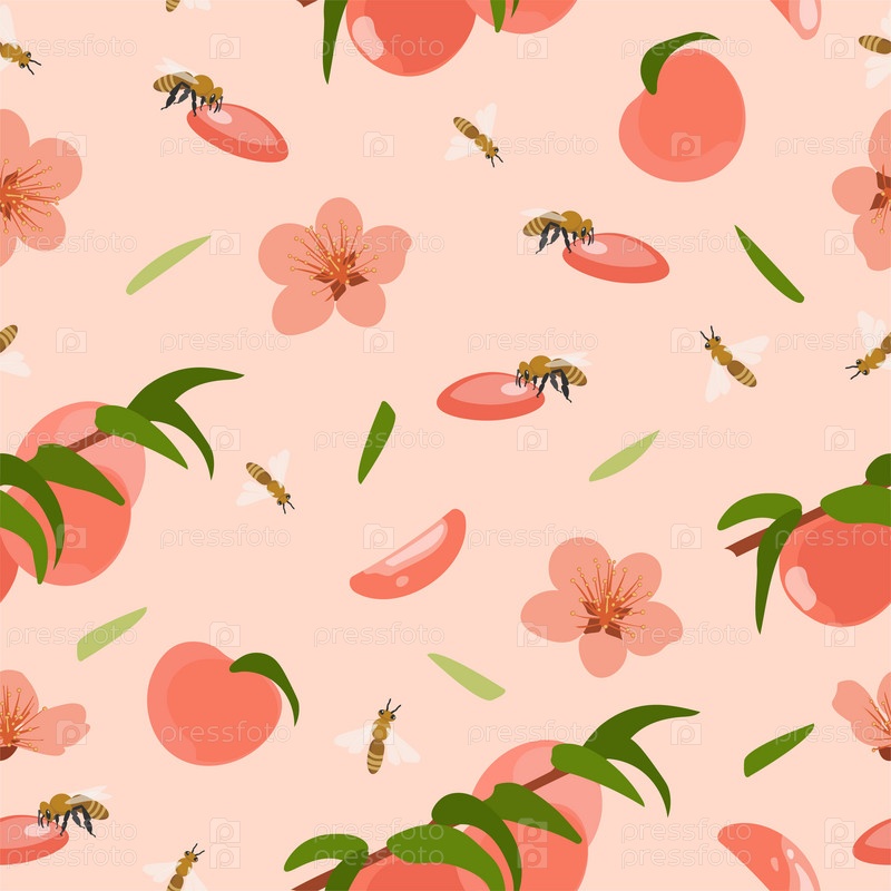 Персиковый или абрикосовый бесшовный узор. Летний тропический бесконечный фон для этикетки, ткани, упаковки. Векторная иллюстрация