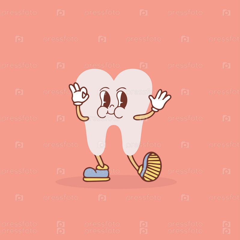 Заводной зубной персонаж мультфильма машет рукой. Забавный здоровый белый коренной зуб со счастливым лицом, ретро-мультяшный талисман зубов, наклейка на стоматологию и стоматологическую помощь векторной иллюстрации 70-х 80-х годов. Векторная иллюстрация