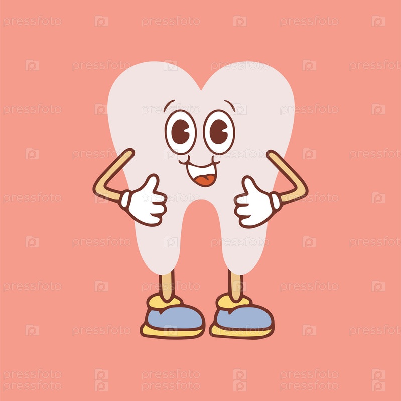 Заводной зубной персонаж мультфильма машет рукой. Забавный здоровый белый коренной зуб со счастливым лицом, ретро-мультяшный талисман зубов, наклейка на стоматологию и стоматологическую помощь векторной иллюстрации 70-х 80-х годов. Векторная иллюстрация