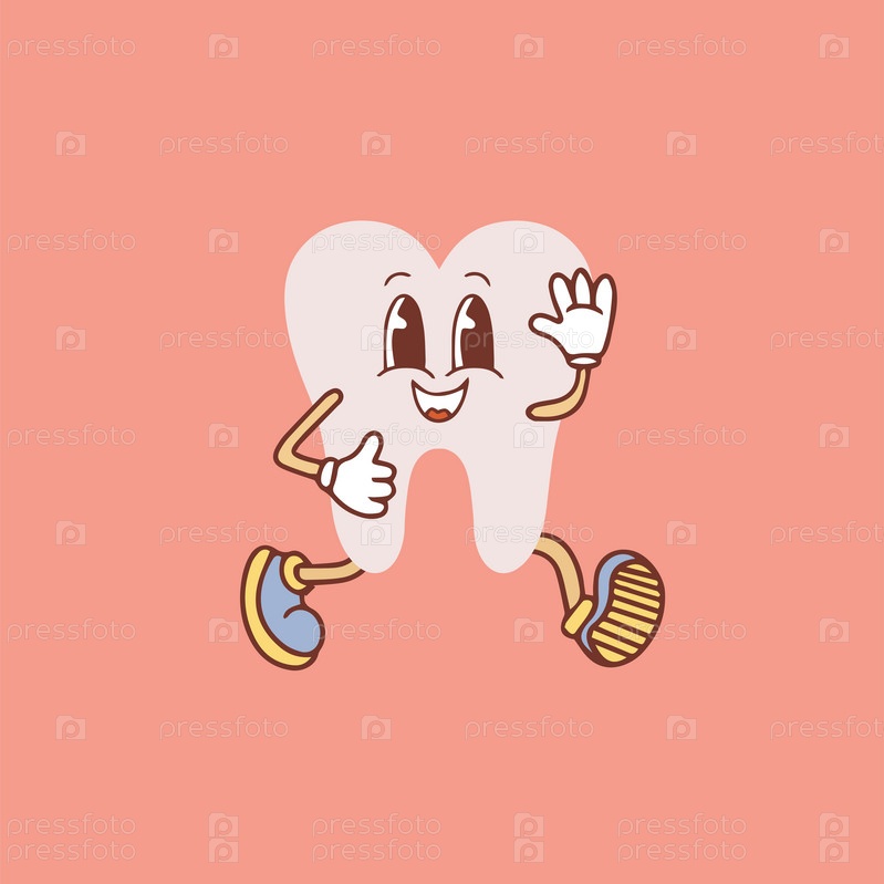 Заводной зубной персонаж мультфильма машет рукой. Забавный здоровый белый коренной зуб со счастливым лицом, ретро-мультяшный талисман зубов, наклейка на стоматологию и стоматологическую помощь векторной иллюстрации 70-х 80-х годов. Векторная иллюстрация